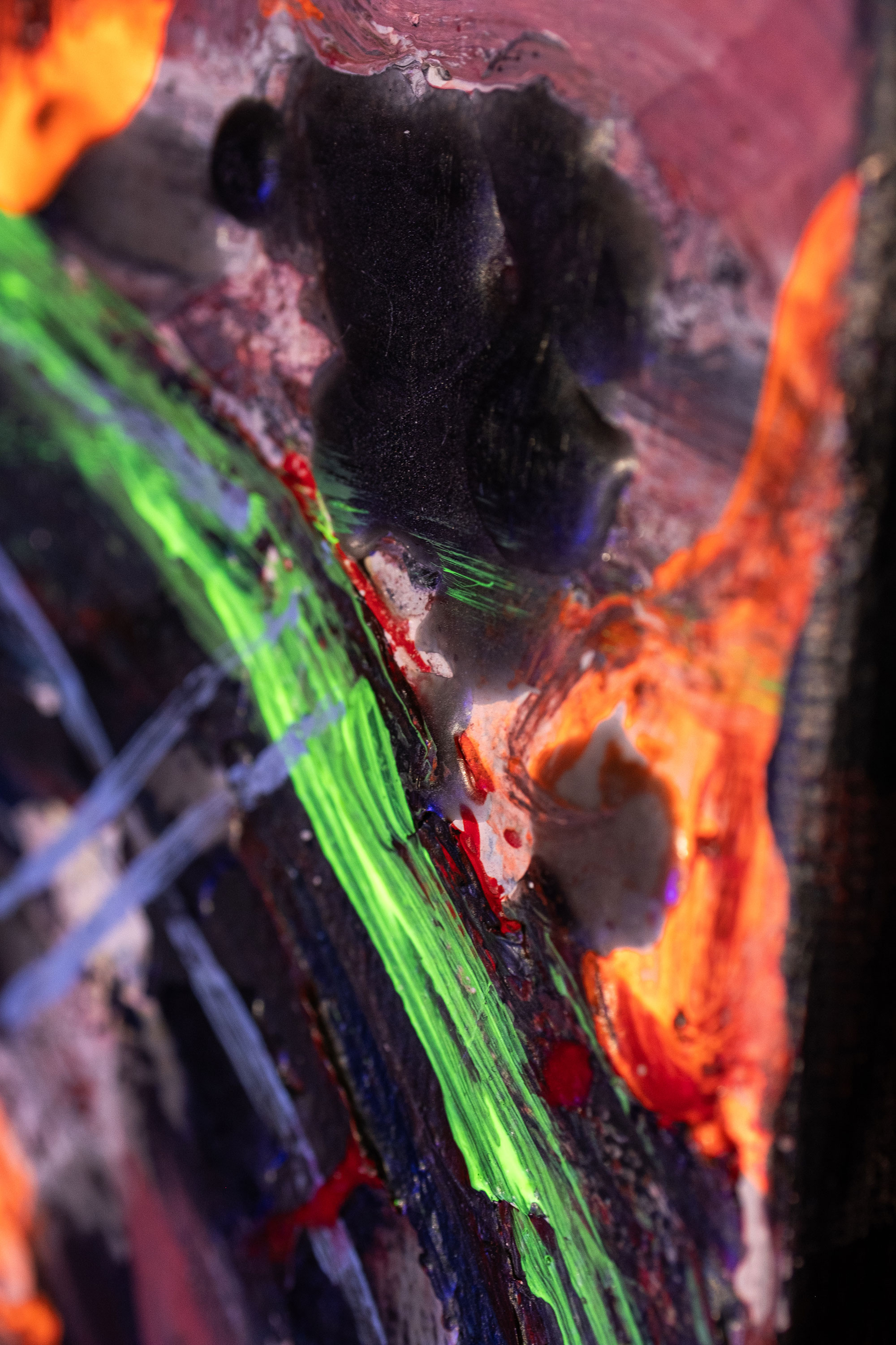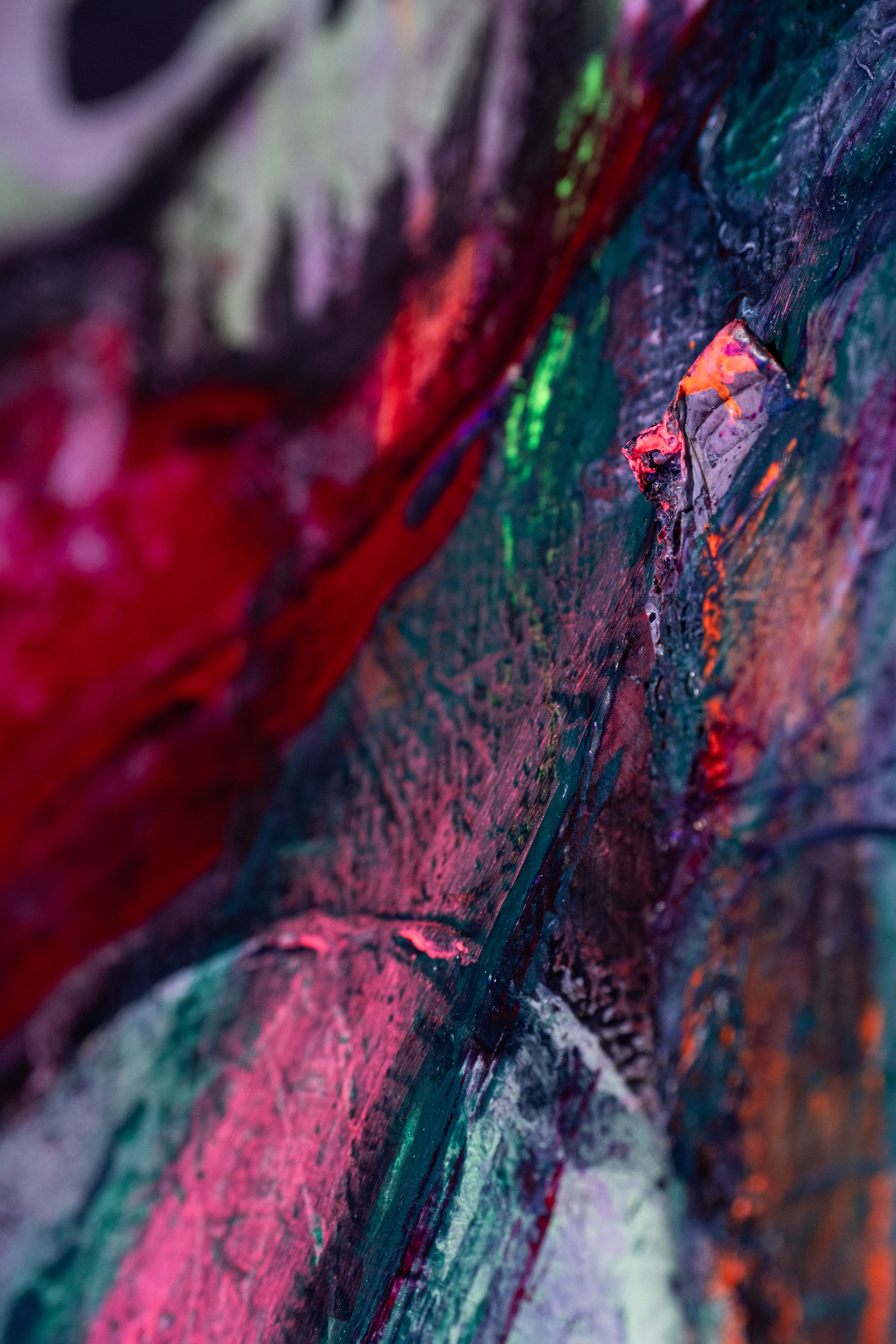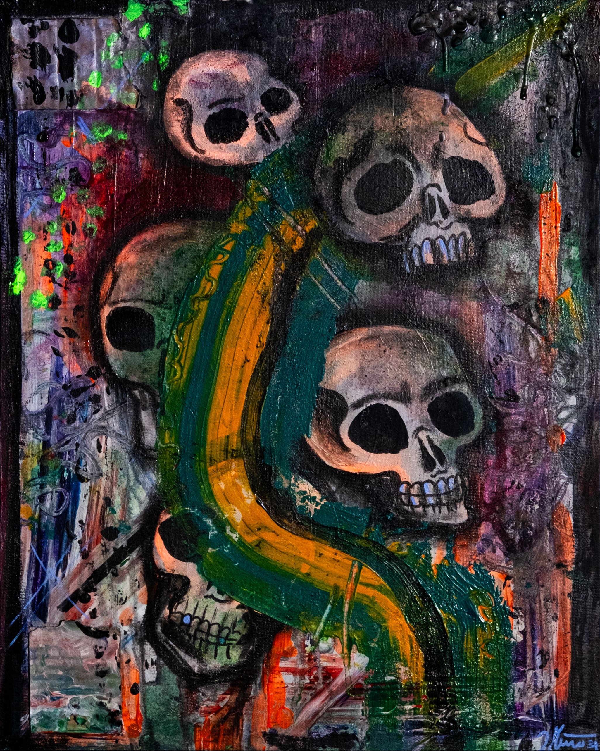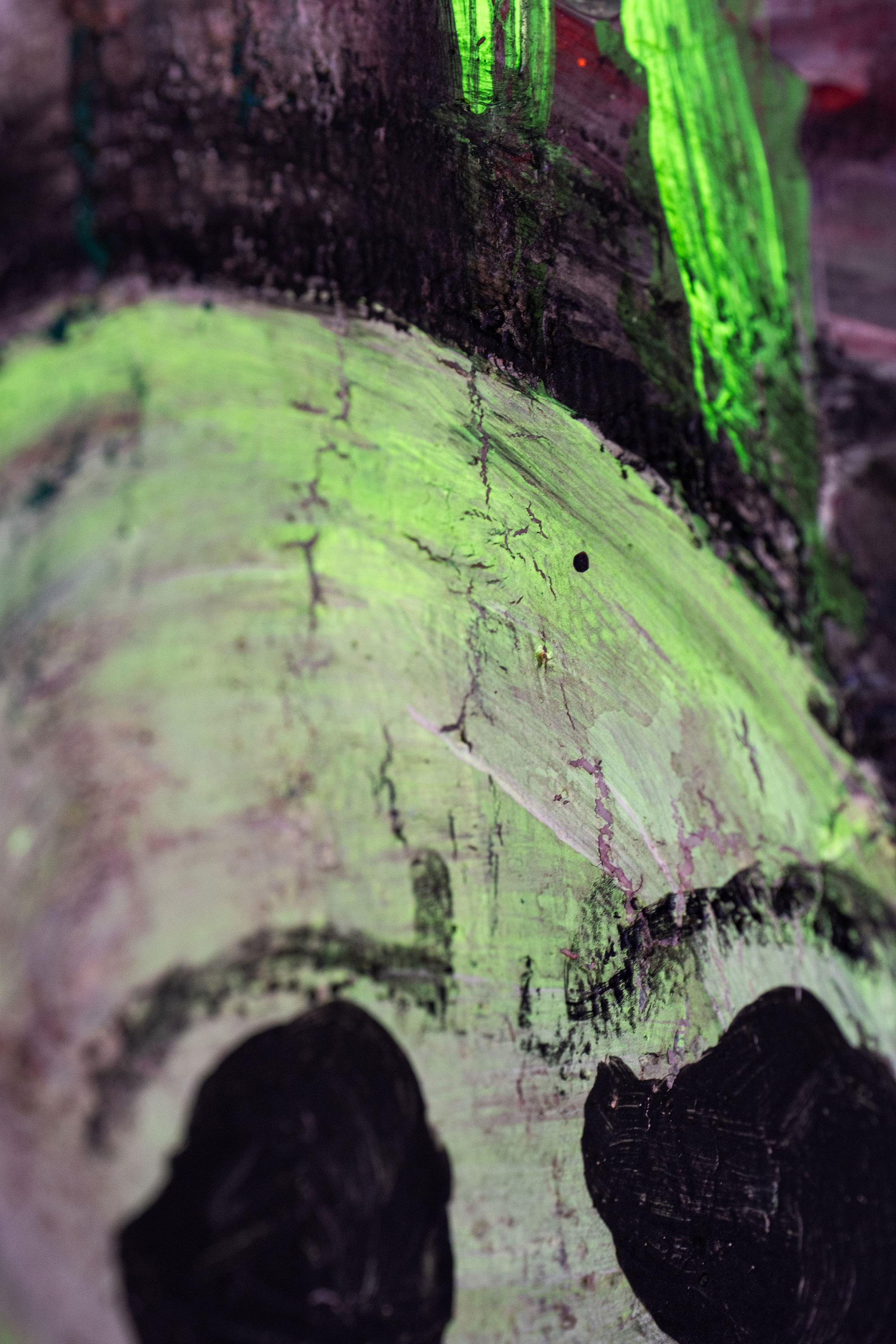 Mich begleitet dieses Thema schon seit vielen Jahren. Erste Acrylgemälde auf Leinwand entstanden 2020, seither wurde die Serie kontinuierlich weiterentwickelt. Ab 2025 kamen neue Mixed-Media-Arbeiten hinzu, in denen ich mit Collage, Ölpastell, Strukturmaterialien und UV-aktiven Farben arbeite. Im Schwarzlicht offenbaren viele Werke eine zusätzliche, fast surreale Wirkungsebene.